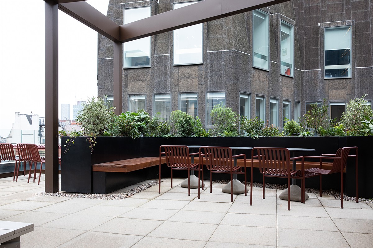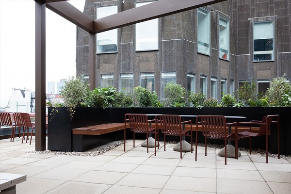 For the Outdoor Paizza, Nest supplied Hay Palissade designs, Balcony Benches & Crate Tables to create seating, dining and lounge areas within the roof terrace setting. Palissade pieces were selected in iron red finish to work within the colour palette for the project and enhance the tones of the building.